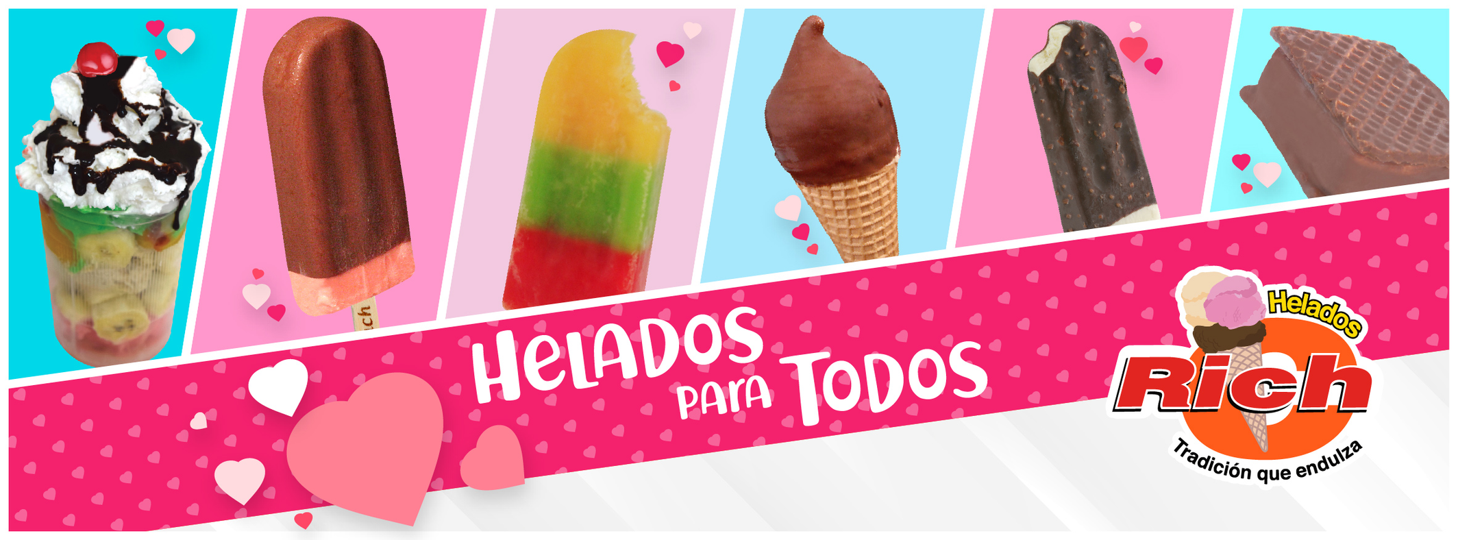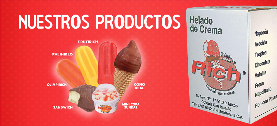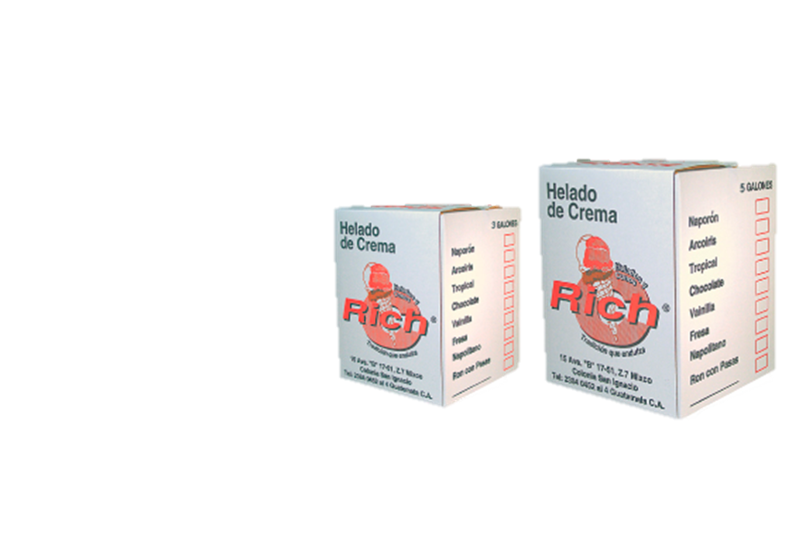 Inicialmente se produjo Conos y Galletas para Helados y debido al éxito obtenido se tomó la decisión de iniciar nuestra propia producción de Helado Boleado RICH y como innovación a la marca, se inicio la producción de una gran variedad de Helados en Paletería.